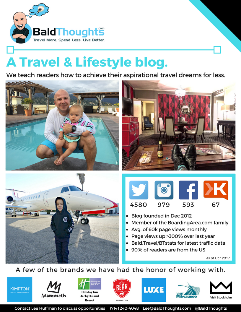 Do you represent a hotel, airline, or destination? We would love to work with you to increase exposure to your brand. When working with brands, opportunities exist to reach our followers via blog posts, social media interactions, and video channels. A customized solution can be created to meet your needs. Click here for a PDF version of our one-page Media Kit.